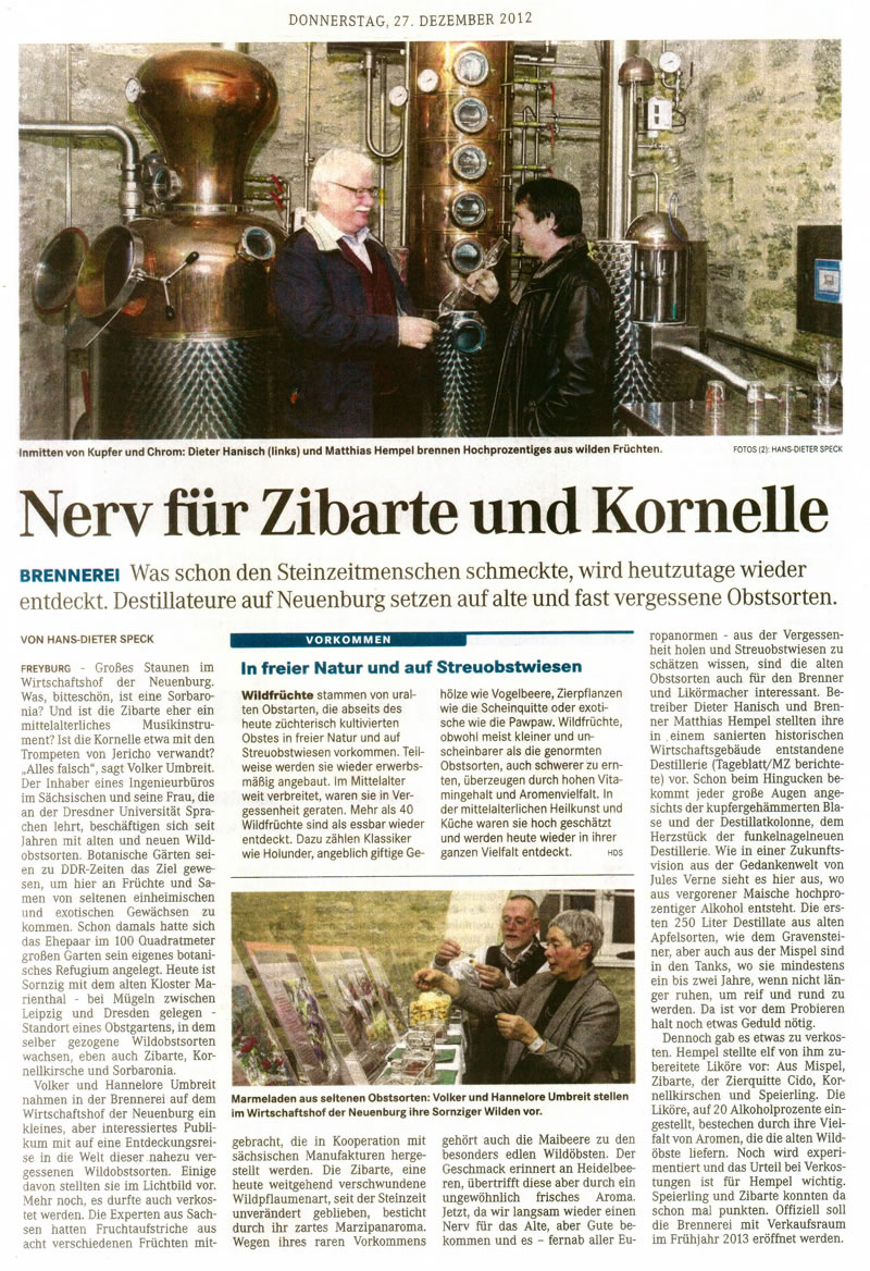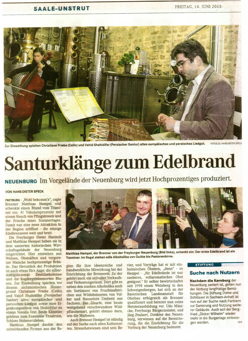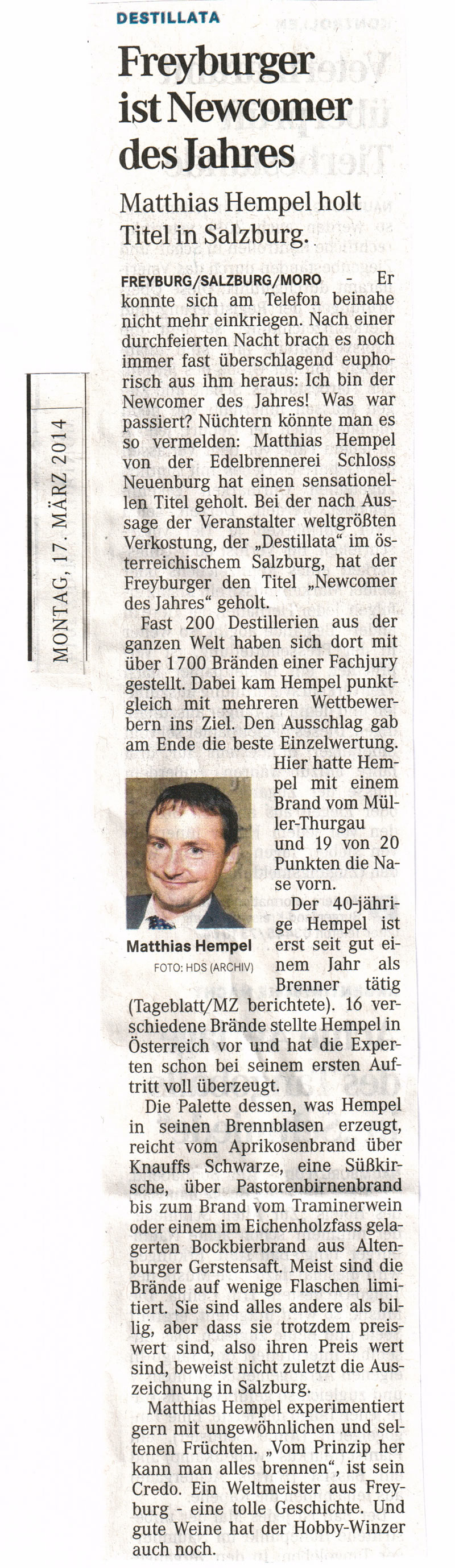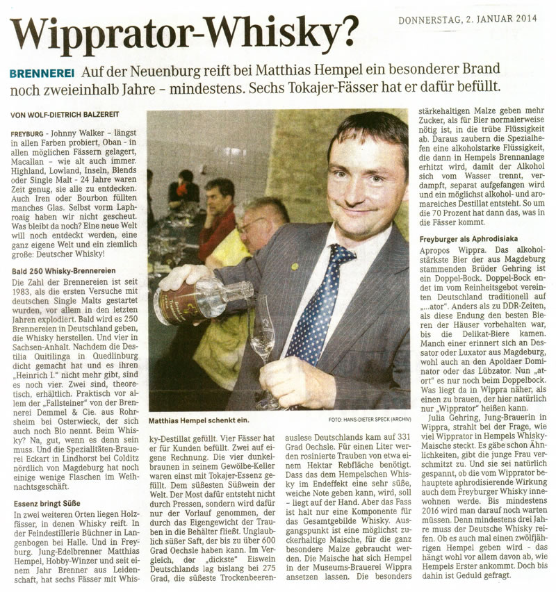 FREYBURG - Matthias Hempel kann die Wände des Verkostungsraumes seiner Edelbrennerei auf der Neuenburg mit einem weiteren Stern schmücken. Erhalten hat er den diesmal nicht für Hochprozentiges, sondern für einen Roten Muskateller, eine Weinsorte, die an Saale-Unstrut nicht häufig ist und die Johannes Beyer in Laucha für das Weinhaus von Matthias Hempel ausgebaut hat. Vergeben wurde der „Kulinarische Stern“ jüngst von Sachsen-Anhalts Ministerpräsidenten Haseloff und Landwirtschaftsministerin Dalbert. Die Winzerei ist für Hempel allerdings nicht Haupterwerb, das ist die Schloss-Brennerei der Neuenburg, die der einstige Anlagenberater und Immobilienmakler 2013 dort in einem ausgebauten Wirtschaftsgebäude eröffnet hat. Deren Erzeugnisse sind inzwischen vielfach ausgezeichnet worden. Auf der Destilata inWien holten 2016 zwölf eingereichte Brände zehn Medaillen. Beim Craft Spirits Festival in Berlin bekamer zwei von nur 16 vergebenen Goldmedaillen. Über 600 Produkte waren dort am Start (Tageblatt/MZ berichtete). Mit dem ersten Whisky, den Hempel im vorigen August nach drei Jahren im Fass auf die Flaschen füllte, ist er imaktuellen Whisky-Guide Deutschland vertreten. Der Brenner experimentiert zu dem gern mit ungewöhnlichen und seltenen Früchten. Ein Elsbeerbrand ist da sein bisheriges Meisterstück. Dieses Kernobst kann man im Gegensatz zu vielen anderen Früchten nicht industriell anbauen und ernten. „Für 200 Kilo Früchtemussman bis zurMaische über 100 Arbeitsstunden aufwenden“, schildert Hempel. Klar, dassman ein solches Tröpfchen nicht zu Supermarktpreisen verkauft. Manch Kunde aber nimmt dafür weite Wege auf sich. Neulich sei jemand aus Frankfurt dagewesen, der Hempels „Elsbeere“ auf Sylt gekostet hat und sich nun beim Erzeuger eindecken wollte. Auf der Ferieninsel nämlich hat ein Küchenchef diesen Brand im Programm, der aus Mitteldeutschland stammt, und der Gästen auch etwas aus seiner Heimat bieten will. Ein solches Regionalbewusstsein würde sich Hempel von noch mehr hiesigen Gastronomen wünschen. Zwar habe eine ganze ReiheHäuser hier seine Brände auf der Karte, doch, so Hempel: „Was Spirituosen angeht, stehtmancher noch an dem Punkt, den er beim Wein schon in den 1990er-Jahren hinter sich gelassen hat. Wer als Tourist hierher kommt,möchte etwas,was hier gewachsen ist - und eben auch, was hier gebrannt wurde“, sagt Hempel. Auszeichnungen können da ein wenig den Weg ebnen. Freyburgs Schloss-Brennmeister hat eine solide Ausbildung hinter sich. Nach einem Schnupperkurs für Obstbrenner 2011 an der Universität Stuttgart/Hohenheim folgte eine zweijährige Ausbildung zum Brenner an der Bayerischen Landesanstalt für Weinbau und Gartenbau in Veitshöchheim. Inzwischen hat Hempel die Ausbildung zum Brennmeister absolviert. Wer nach einer touristischen Führung durch eine Whisky-Destille denkt, das hat doch der Opa nach dem Krieg in seiner Küche auch hinbekommen, ist auf dem Holzweg. Einen guten Schnaps zu brennen, das ist eine Herausforderung, weiß der Brennmeister von der Neuenburg.